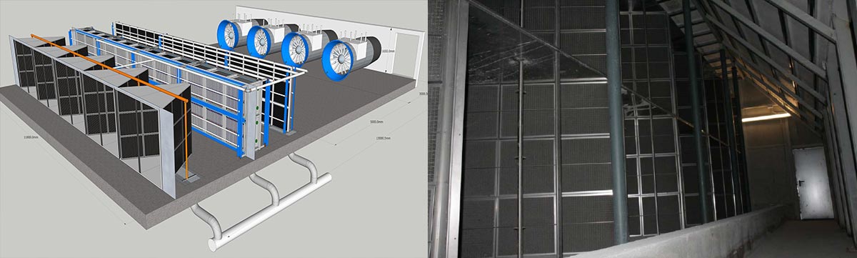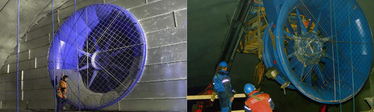轴流风机,把空气从隧道中抽取出来,净化后再送回去或排放出去。低速运转,我们采用的大型轴流风机,不但能节约风机能耗,更能使气流均匀。